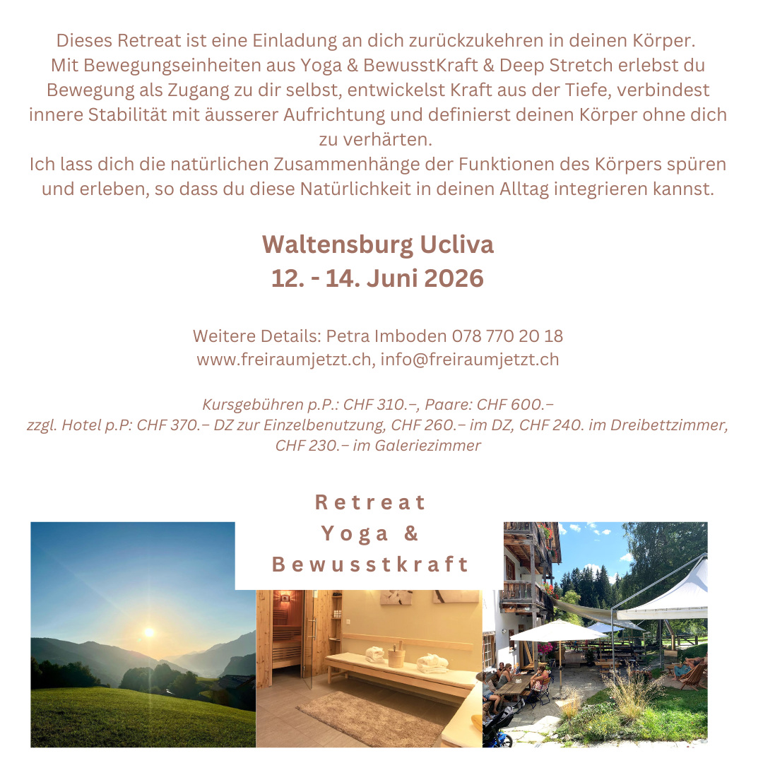 Dieses Retreat lädt dich ein, in deinen Körper zurückzukehren. Durch Yoga, BewusstKraft und Deep Stretch erlebst du Bewegung als Zugang zu dir selbst, entwickelst tiefe Kraft, verbindest innere Stabilität mit äusserer Aufrichtung und definierst deinen Körper ohne Härte. Du lernst, die natürlichen Zusammenhänge des Körpers zu spüren und diese Qualität in deinen Alltag mitzunehmen.